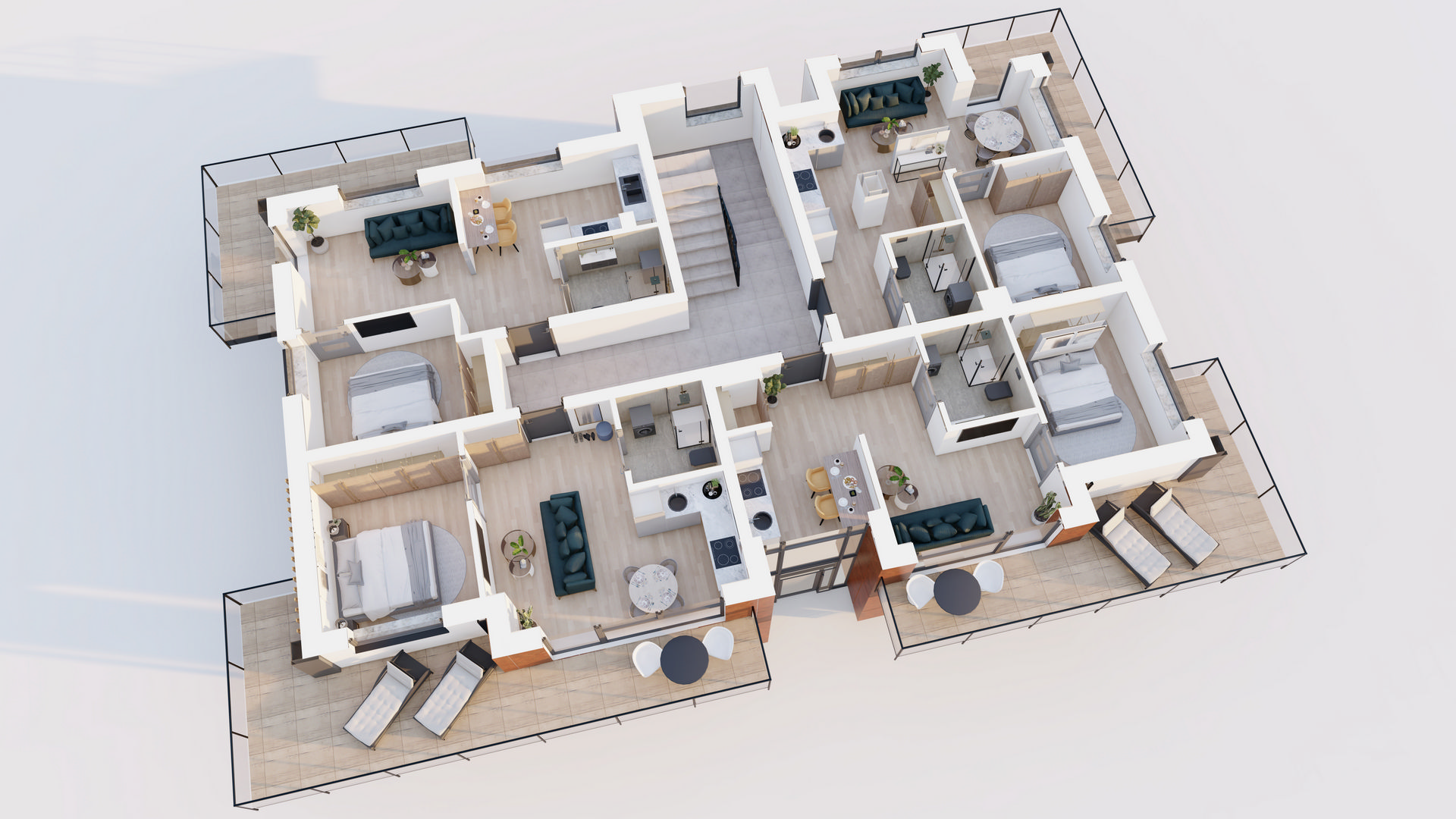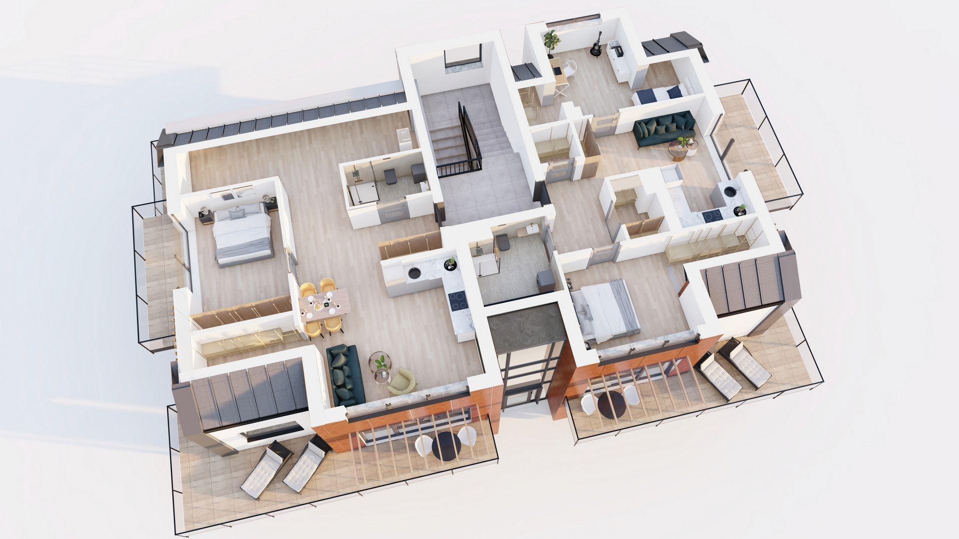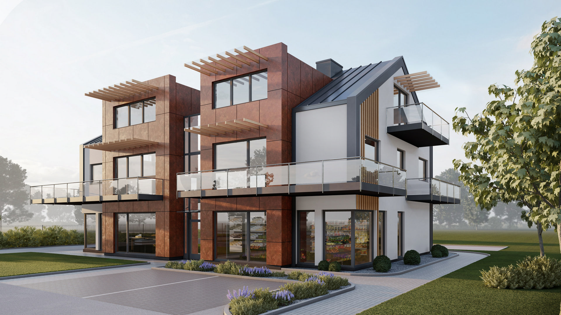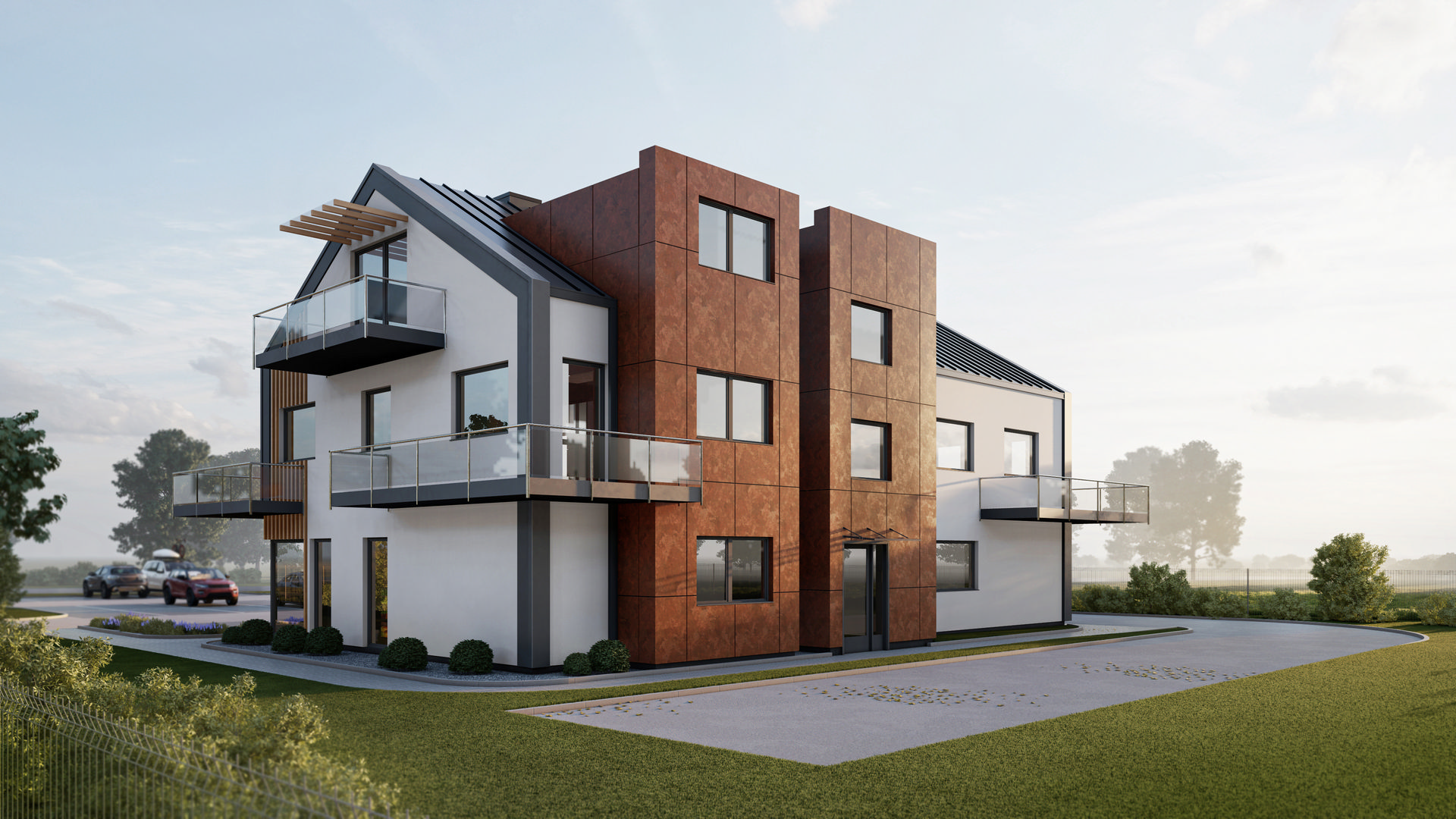 Całość obiektu została utrzymana w kolorach szarości, rdzawych brązów w okładzinach z płyt HPL oraz beżowych tynkach. Kolorystyka ta nadaje budynkowi zdecydowanego wyrazu, a wysokiej jakości materiały będą stanowić dla Inwestora atut w przypadku sprzedaży lub wynajmu.