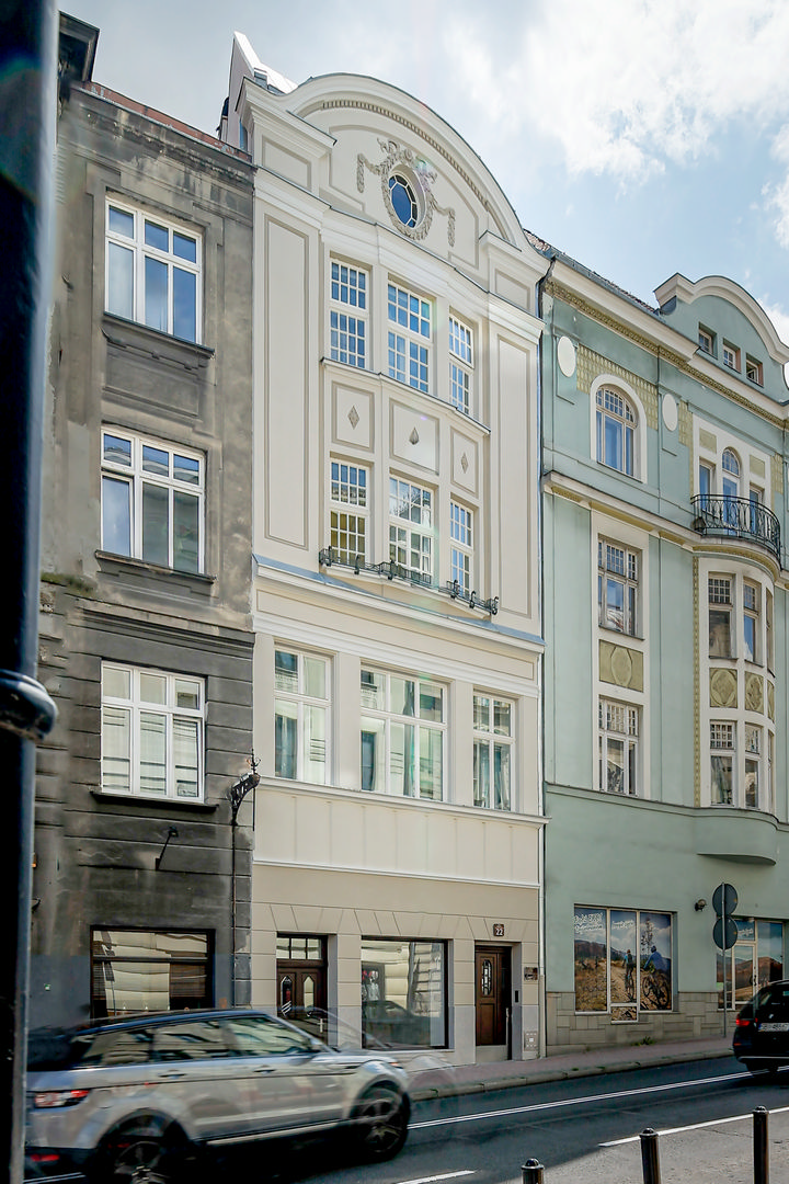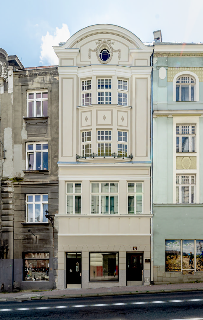 Niewielka elewacja kamienicy przy ul. Wzgórze 22 kryje za sobą obszerny i piękny historyczny budynek. Naszym zadaniem było pomóc odzyskać blask tej elewacji, znajdującej się przecież w jednej z kluczowych panoram widokowych Bielska-Białej, w otwarciu ulicy Stojałowskiego na Zamek Sułkowskich.